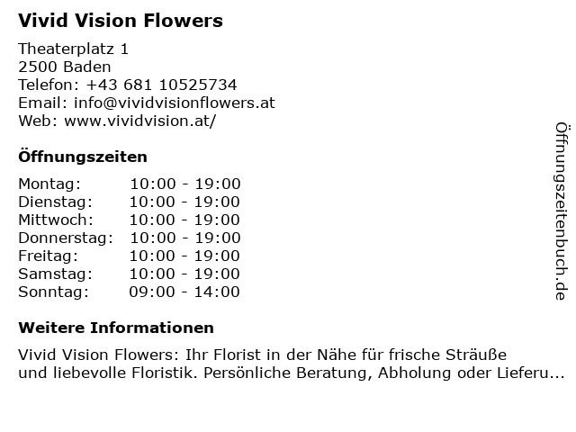 | Öffnungszeiten Vivid Vision Flowers in Baden anzeigen | |