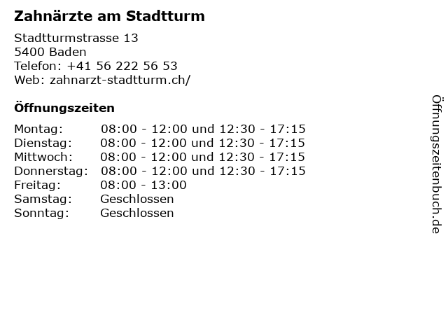 | Öffnungszeiten Zahnärzte am Stadtturm in Baden anzeigen | |