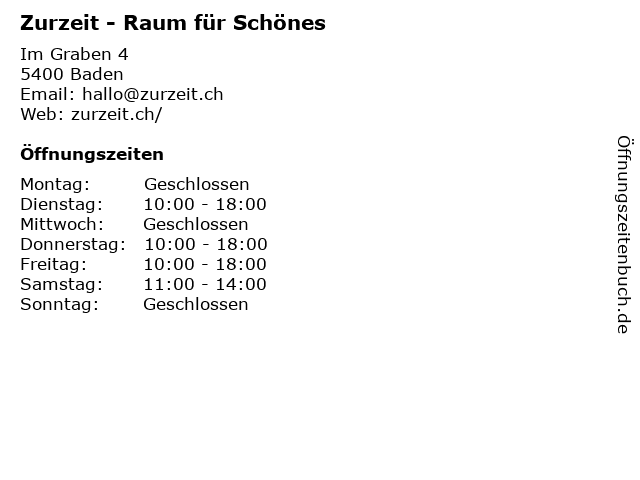 | Öffnungszeiten Zurzeit - Raum für Schönes in Baden anzeigen | |