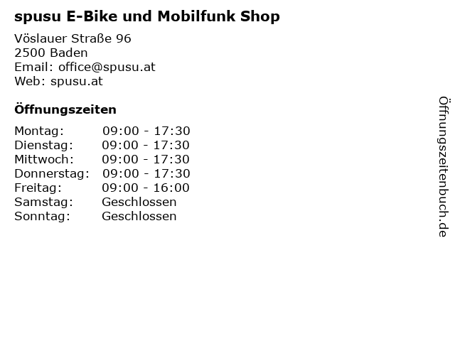 | Öffnungszeiten spusu E-Bike und Mobilfunk Shop in Baden anzeigen | |
