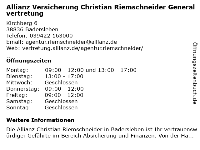 1 Allianz Versicherung Christian Riemschneider Generalvertretung (Entfernung: 17,28 km) Steinweg 32, 39393 Hötensleben 2 Allianz Versicherung Thomas Schwarz Generalvertretung (Entfernung: 13,67 km) Röderhofer Straße 12, 38820 Halberstadt 3 Allianz Generalvertretung Thomas Schwarz (Entfernung: 13,68 km) Röderhofer Str. 12, 38820 Halberstadt 4 Allianz Versicherung Jeannette Stach Generalvertretung (Entfernung: 14,27 km) Bakenstraße 37, 38820 Halberstadt 5 Allianz Versicherung Christian Gerloff Generalvertretung (Entfernung: 15,15 km) Kühlinger Str. 1 - 2, 38820 Halberstadt 6 Allianz Versicherung Christian Gerloff Generalvertretung (Entfernung: 15,15 km) Kühlinger Straße 1-2, 38820 Halberstadt |