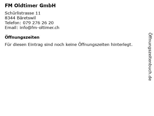 | Öffnungszeiten FM Oldtimer GmbH in Bäretswil anzeigen | |