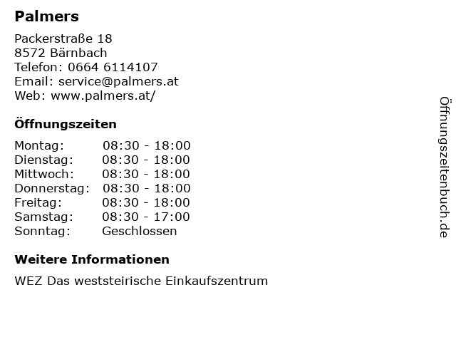 | Öffnungszeiten Palmers in Bärnbach anzeigen | |