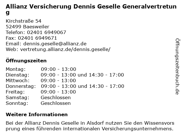 1 Allianz Versicherung Daniel Brasnic Generalvertretung (Entfernung: 0,00 km) Luisenstraße 16, 52477 Alsdorf 2 Allianz Generalvertretung Achim Stollenwerk (Entfernung: 1,59 km) Joseph-von-Fraunhofer-Str. 3a, 52477 Alsdorf 3 Allianz Versicherung Elke Wolff e.Kfr. Generalvertretung (Entfernung: 3,70 km) Peterstraße 4 a, 52499 Baesweiler 4 Allianz Versicherung Meiß und Classen OHG Generalvertretung (Entfernung: 5,11 km) Kalvarienbergstraße 53, 52249 Eschweiler 5 AXA Versicherung - Generalvertretung Heiner Schmalen (Entfernung: 6,14 km) Hauptstraße 161, 52146 Würselen 6 AXA Versicherung - Generalvertretung Achim Ohlert (Entfernung: 6,94 km) Karl-Carstens-Str. 1, 52146 Würselen |