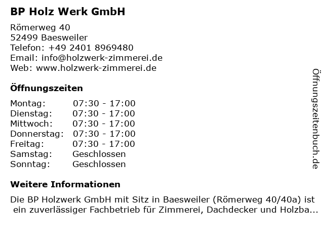 | Öffnungszeiten BP Holz Werk GmbH in Baesweiler anzeigen | |