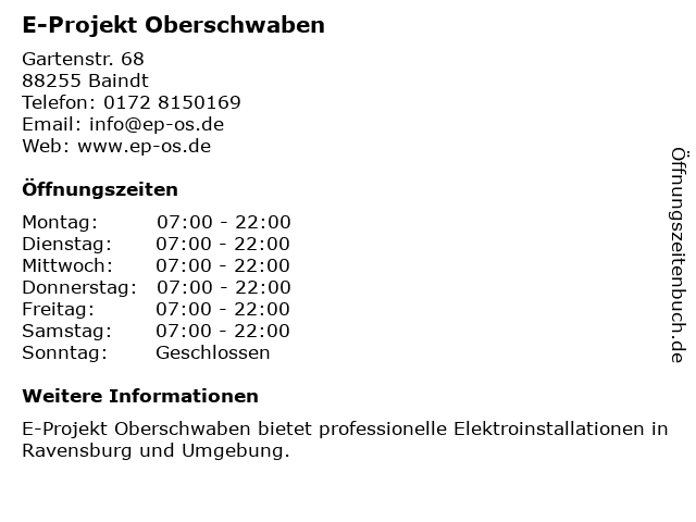 | Öffnungszeiten E-Projekt Oberschwaben in Baindt anzeigen | |