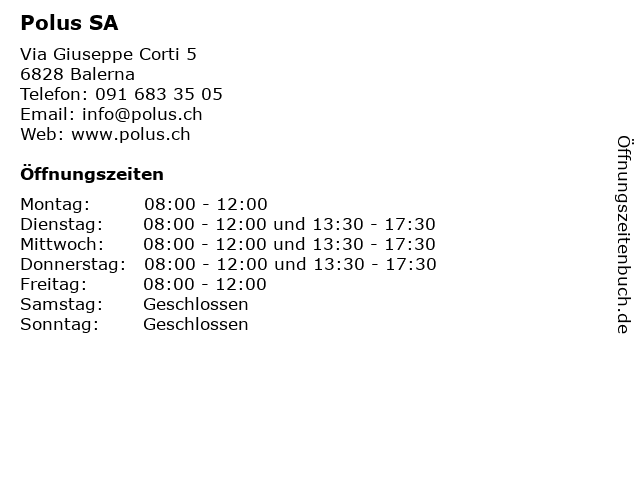 | Öffnungszeiten Polus SA in Balerna anzeigen | |