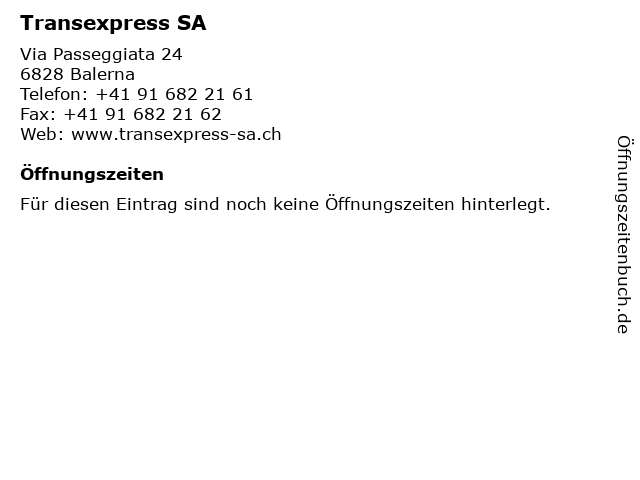 | Öffnungszeiten Transexpress SA in Balerna anzeigen | |