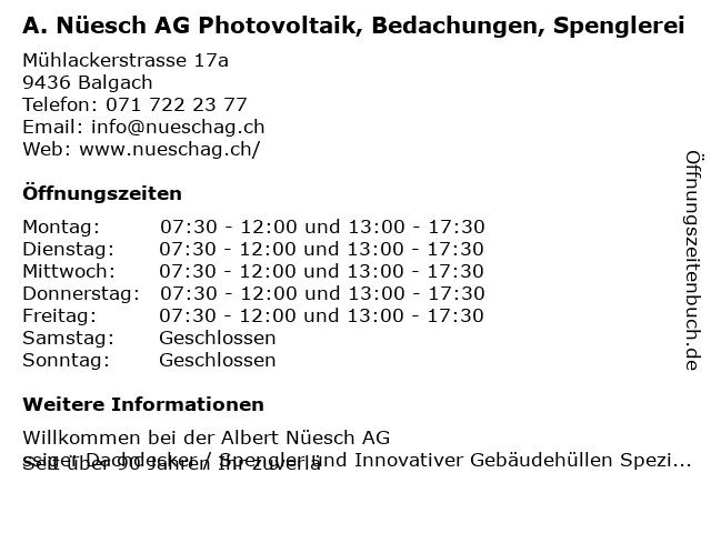 Öffnungszeiten A. Nüesch AG Photovoltaik, Bedachungen, Spenglerei