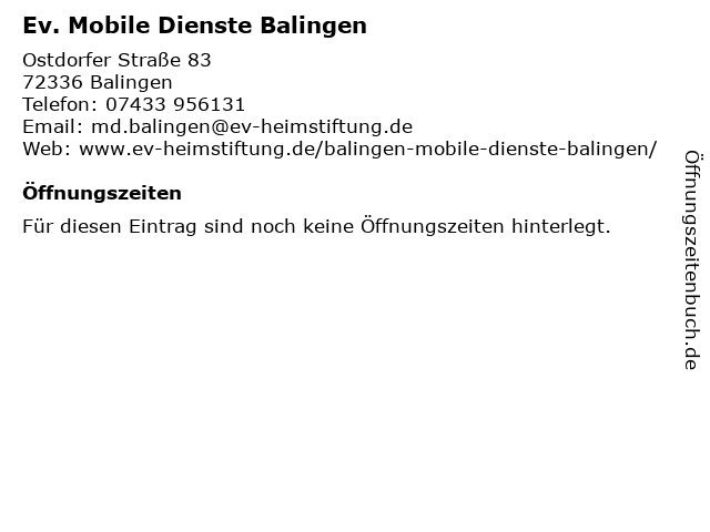 | Öffnungszeiten Ev. Mobile Dienste Balingen in Balingen anzeigen | |