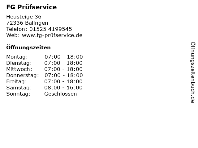 | Öffnungszeiten FG Prüfservice in Balingen anzeigen | |