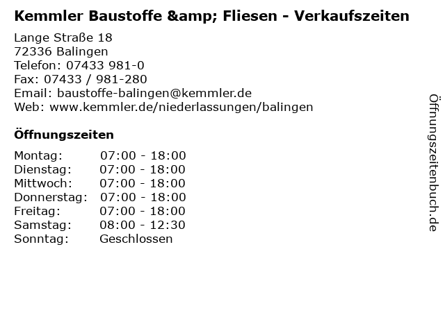 1 Kemmler Baustoffe & Fliesen - Verkaufszeiten (Entfernung: 14,66 km) Brunnenstraße 17-19, 72379 Hechingen 2 Kemmler Baustoffe & Fliesen - Ausstellungszeiten (Entfernung: 0,00 km) Lange Straße 18, 72336 Balingen 6 |