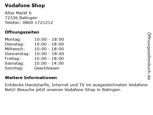 | Öffnungszeiten Vodafone Shop in Balingen anzeigen | |
