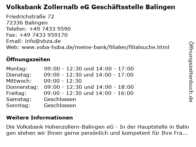 1 Volksbank Zollernalb eG Geschäftsstelle Balingen (Entfernung: 0,02 km) Friedrichstraße 72, 72336 Balingen 5 Lebenshilfe für Behinderte Zollernalb e.V., Wohnheim (Entfernung: 6,78 km) Raichbergstr. 2, 72406 Bisingen 6 Kreisfeuerwehrverband Zollernalb e.V. Vorsitzender Karl Dehner (Entfernung: 7,48 km) Richard-Wagner-Str. 8, 72406 Bisingen |