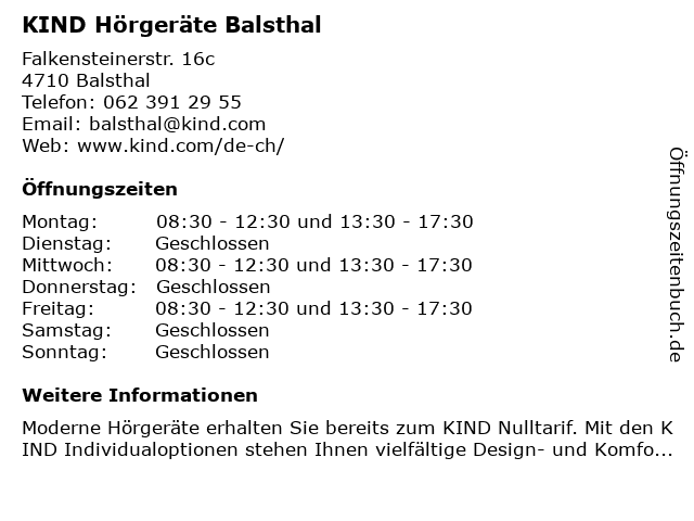 | Öffnungszeiten KIND Hörgeräte Balsthal in Balsthal anzeigen | |