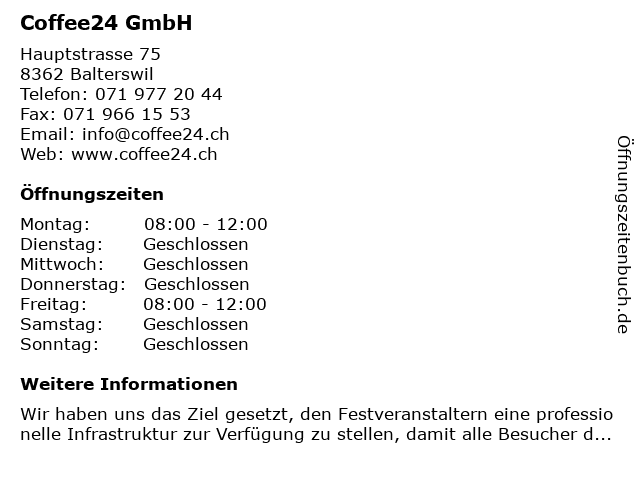 | Öffnungszeiten Coffee24 GmbH in Balterswil anzeigen | |