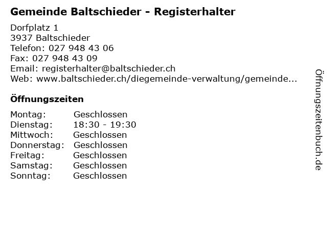 1 Gemeindeverwaltung Törbel - Öffnungszeiten Registerhalter (Entfernung: 2,65 km) Rathaus -, 3923 Törbel 2 Stadtgemeinde Brig-Glis - Registerhalter / Baupolizei (Entfernung: 8,80 km) Überlandstrasse 60, 3902 Glis 6 Gemeinde Randa - Registerhalter, Kataster & Schatzungskommission (Entfernung: 24,06 km) Dorf -, 3928 Randa |