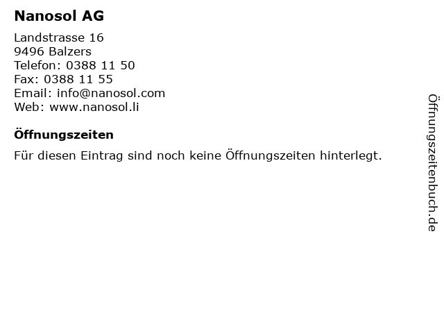 | Öffnungszeiten Nanosol AG in Balzers anzeigen | |