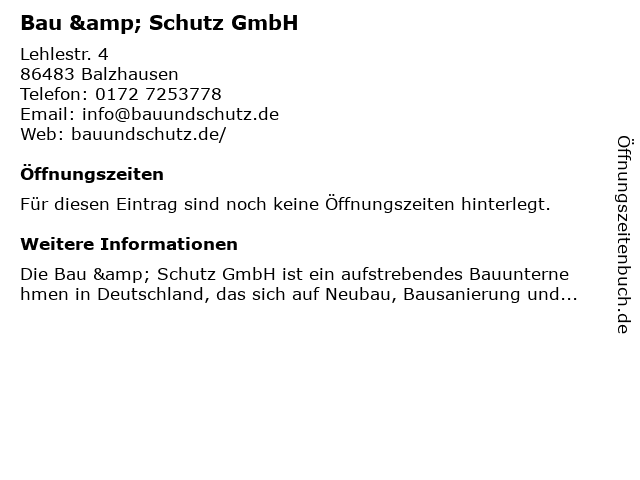 | Öffnungszeiten Bau & Schutz GmbH in Balzhausen anzeigen | |
