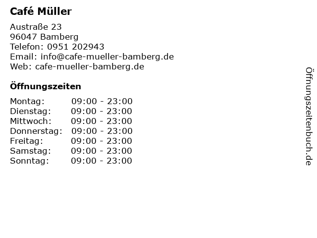| Öffnungszeiten Café Müller in Bamberg anzeigen | |
