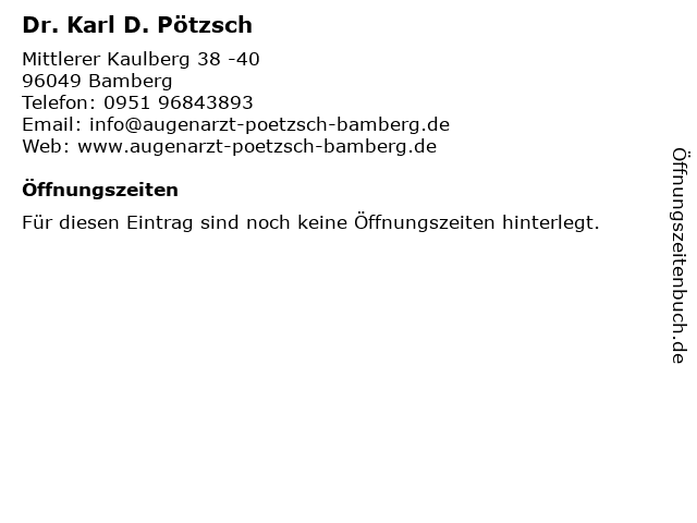 | Öffnungszeiten Dr. Karl D. Pötzsch in Bamberg anzeigen | |