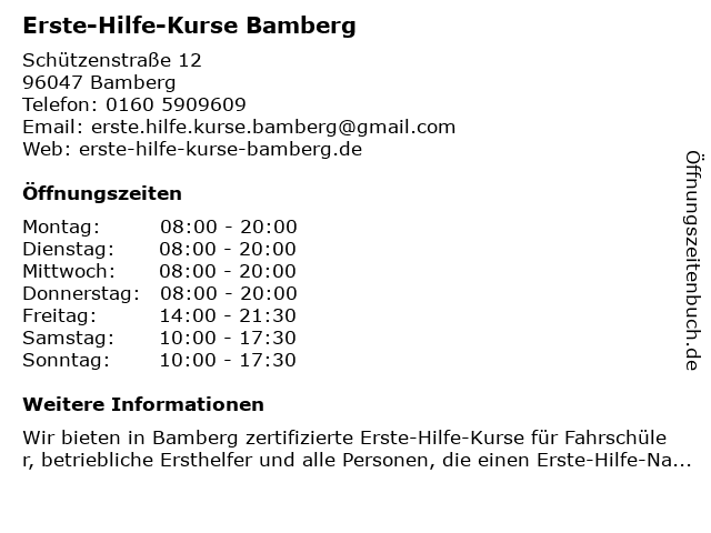 | Öffnungszeiten Erste-Hilfe-Kurse Bamberg in Bamberg anzeigen | |