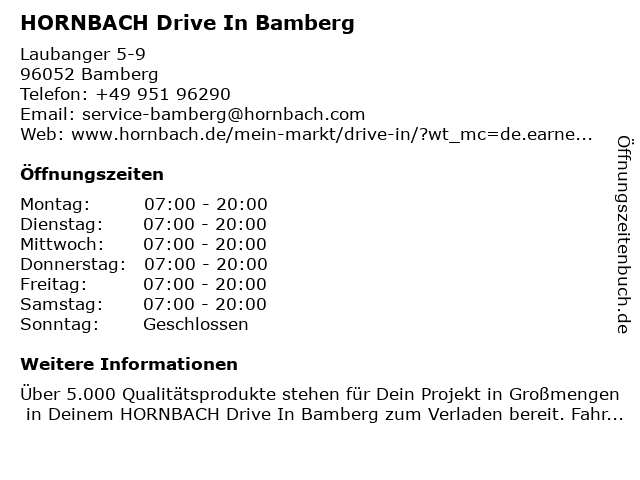 | Öffnungszeiten HORNBACH Drive In Bamberg in Bamberg anzeigen | |