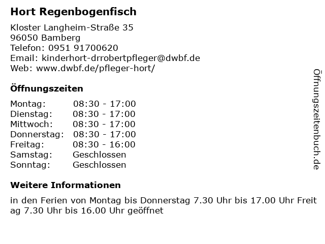 | Öffnungszeiten Hort Regenbogenfisch in Bamberg anzeigen | |