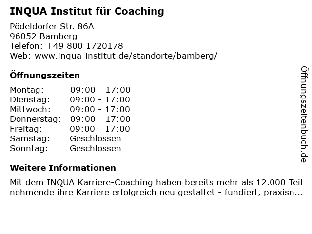 | Telefonnummer INQUA Institut für Coaching in Bamberg (+49 800 1720178) anrufen | |