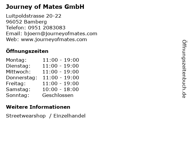 | Öffnungszeiten Journey of Mates GmbH in Bamberg anzeigen | |