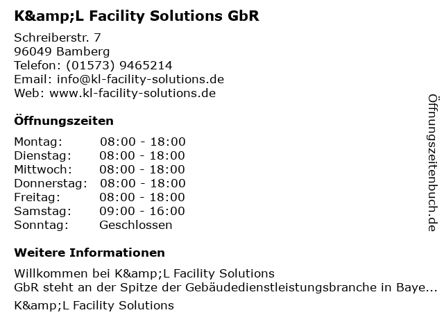 | Öffnungszeiten K&L Facility Solutions GbR in Bamberg anzeigen | |