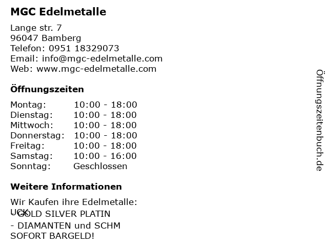 Öffnungszeiten MGC Edelmetalle in Bamberg anzeigen | |