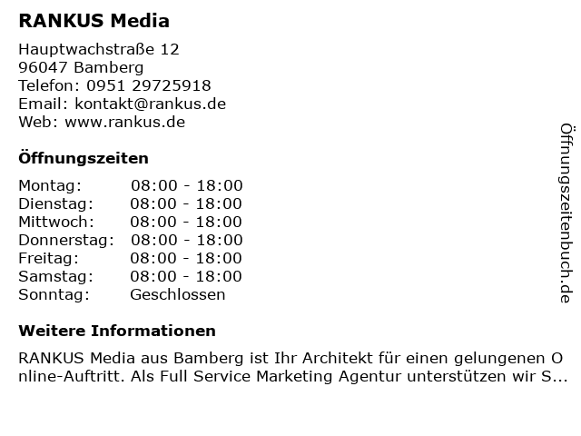 | Öffnungszeiten RANKUS Media in Bamberg anzeigen | |