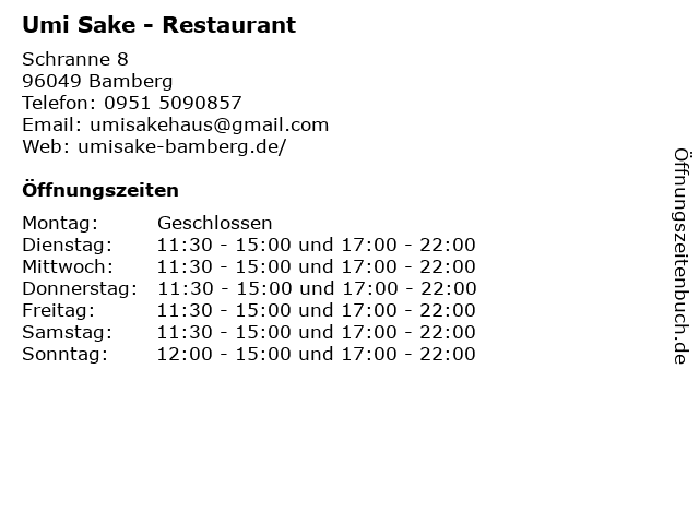| Öffnungszeiten Umi Sake - Restaurant in Bamberg anzeigen | |