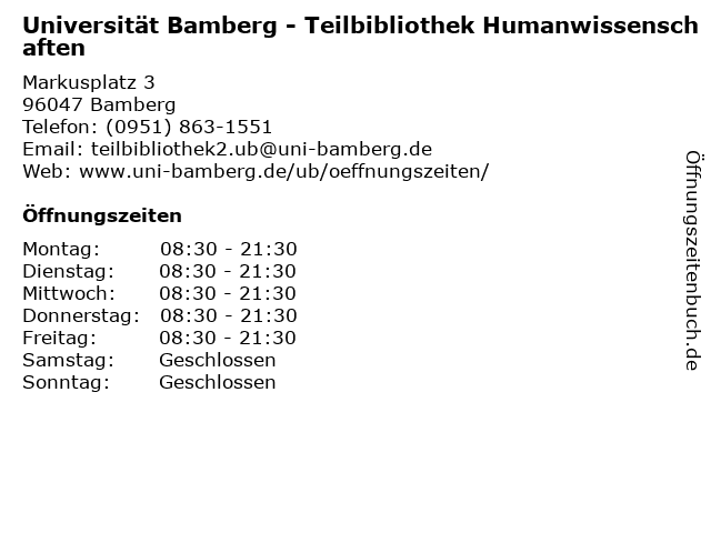 Branchen & Suchbegriffe zu Universität Bamberg - Teilbibliothek Humanwissenschaften:bibliothek, buch, buchscanner, humanwissenschaften, literaturen, sprachen, teilbibliothek, universität |