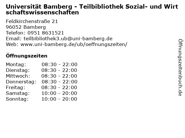 Branchen & Suchbegriffe zu Universität Bamberg - Teilbibliothek Sozial- und Wirtschaftswissenschaften:bibliothek, sozial, tb, teilbibliothek, universität, universitätsbibliothek, universitätsbibliothek tb 3, wirtschaftswissenschaften |