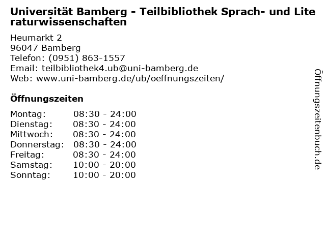 Branchen & Suchbegriffe zu Universität Bamberg - Teilbibliothek Sprach- und Literaturwissenschaften:bibliothek, buch, buchscanner, literaturen, literaturwissenschaften, sprach, sprachen, teilbibliothek, universität |