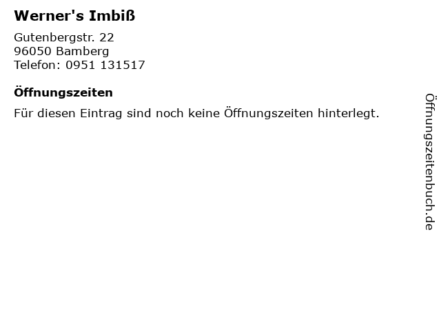 | Öffnungszeiten Werner's Imbiß in Bamberg anzeigen | |