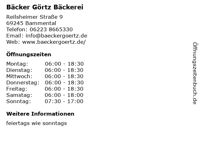 | Öffnungszeiten Bäcker Görtz Bäckerei in Bammental anzeigen | |