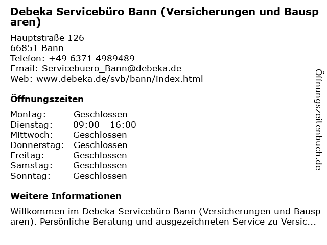 2 Debeka-Servicebüro Ramstein-Miesenbach (Entfernung: 8,07 km) Bahnhofstr. 5a, 66877 Ramstein-Miesenbach 3 Debeka Servicebüro Schwedelbach (Versicherungen und Bausparen) (Entfernung: 12,17 km) Kollweilerstraße 3, 67685 Schwedelbach 6 |