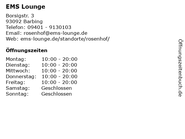 | Öffnungszeiten EMS Lounge in Barbing anzeigen | |