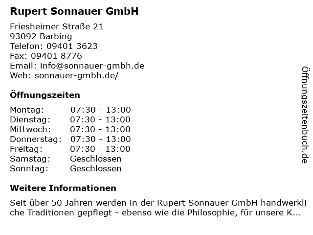 | Öffnungszeiten Rupert Sonnauer GmbH in Barbing anzeigen | |