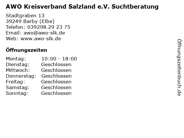 1 AWO Kreisverband Salzland e.V. Suchtberatung (Entfernung: 9,28 km) Lessingstr. 4, 39240 Calbe (Saale) 2 AWO Kreisverband Salzland e.V. Suchtberatung (Entfernung: 11,61 km) Otto-Kohle-Str. 23, 39218 Schönebeck (Elbe) 6 |