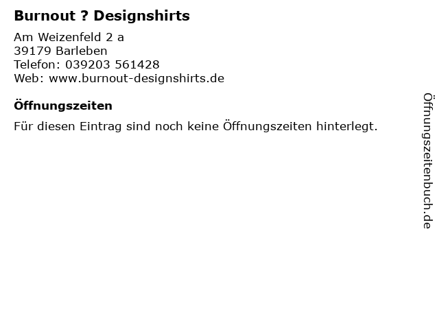| Öffnungszeiten Burnout ? Designshirts in Barleben anzeigen | |