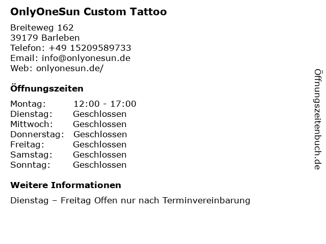 | Öffnungszeiten OnlyOneSun Custom Tattoo in Barleben anzeigen | |