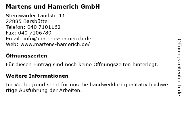 | Öffnungszeiten Martens und Hamerich GmbH in Barsbüttel anzeigen | |