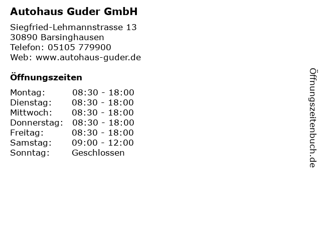 | Öffnungszeiten Autohaus Guder GmbH in Barsinghausen anzeigen | |