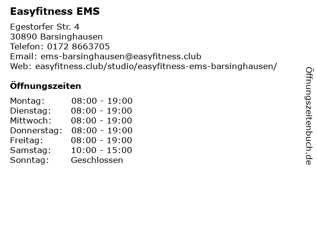 | Öffnungszeiten Easyfitness EMS in Barsinghausen anzeigen | |