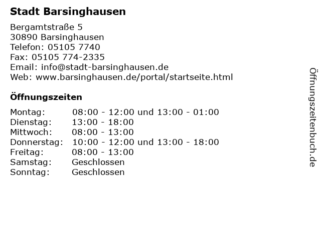 | Öffnungszeiten Stadt Barsinghausen in Barsinghausen anzeigen | |