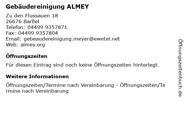 | Öffnungszeiten Gebäudereinigung ALMEY in Barßel anzeigen | |